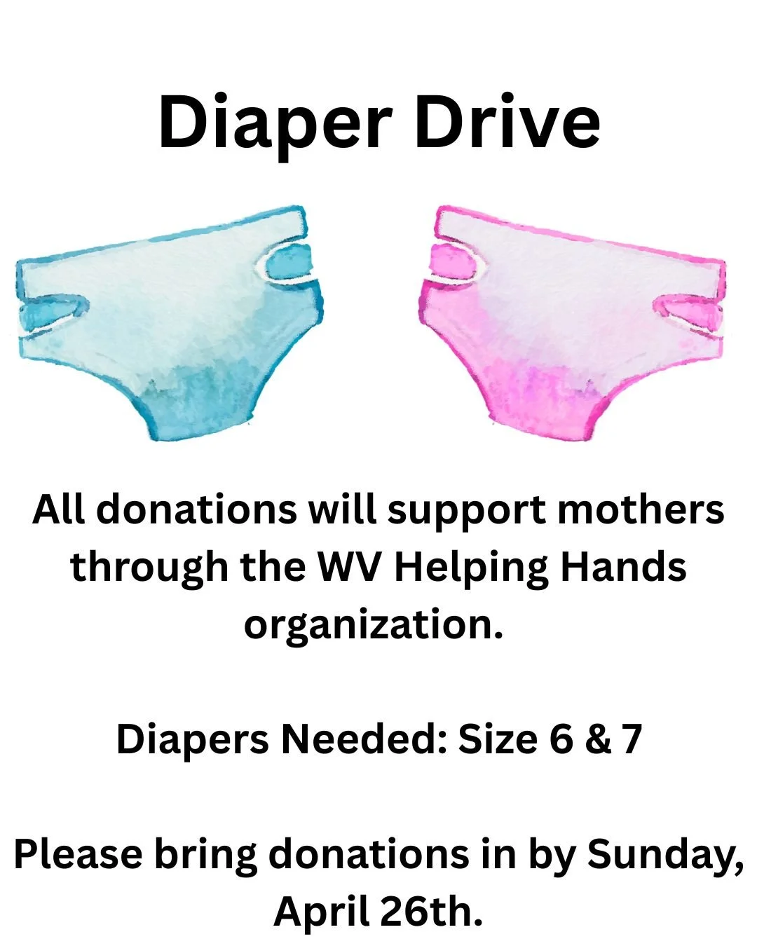 Our ladies church group are spearheading an effort to collect diapers in size 6 and 7 for the WV Helping Hands organization. Diapers can be dropped off in the foyer. There is a box designated for your donation. Diapers need to be turned in by April 26